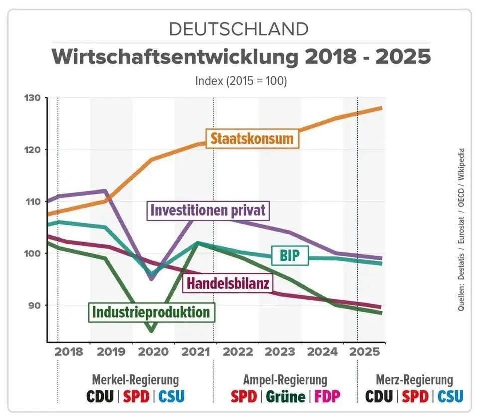 Německo vyrostlo jako průmyslová velmoc. Bylo světovým lídrem v automobilovém průmyslu (Mercedes, BMW, Audi, Volkswagen…), mělo silný chemický průmysl, ocelářství, farmacii… A dnes? Projděte si zprávy o jednotlivých společnostech, jak zavírají továrny v Německu a přesouvají výrobu nejen do Asie, ale i do USA. Jak jim padají podíly na trzích a zisky.